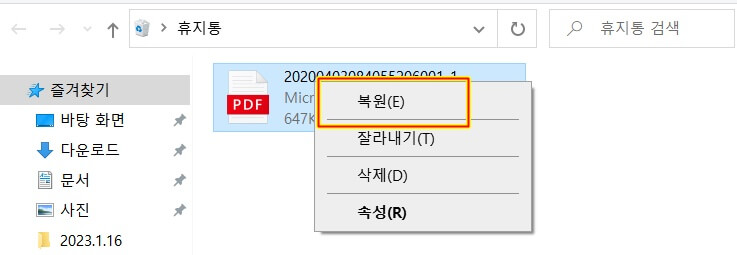 휴지통에서는 해당 파일이 사라지고, 처음에 파일 삭제했던 그 폴더로 되돌아갑니다.
