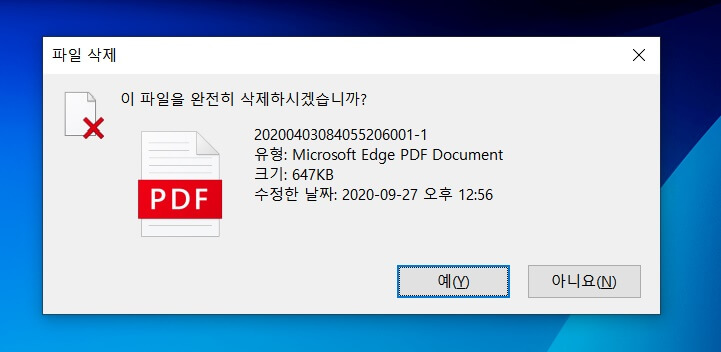 영구 삭제할 파일이 맞다면 "예"를 눌러줍니다.
