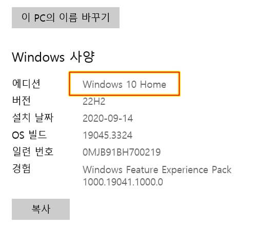제 윈도우 사양은 윈도우 10 Home 입니다. 참고하시면 좋을 것 같아요.