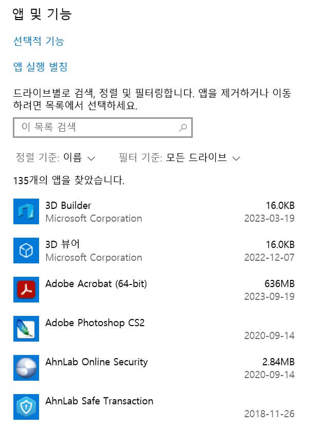 앱을 클릭하면 아래와 같이 현재 내 PC에 설치된 프로그램들이 쭉 올라옵니다.